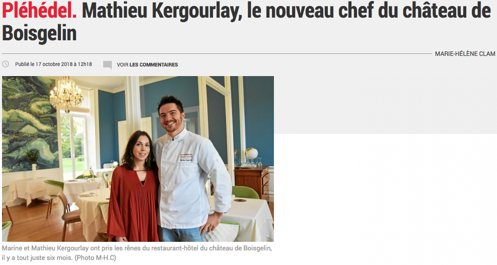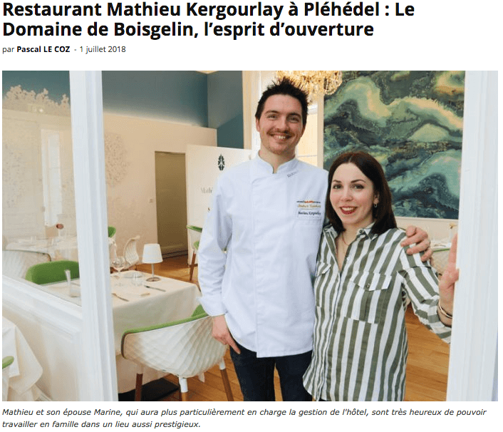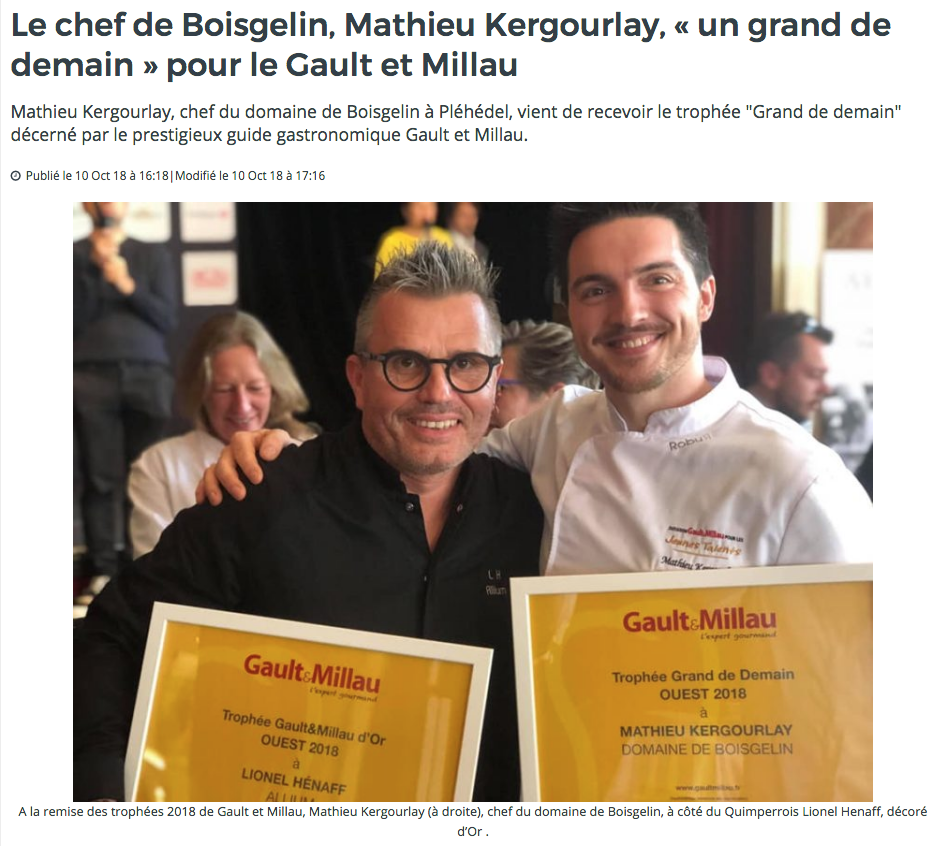 Mathieu Kergourlay, chef du domaine de Boisgelin à Pléhédel, vient de recevoir le trophée « Grand de demain » décerné par le prestigieux guide gastronomique Gault et Millau.